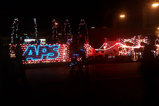 Tonight, Jay and I went to our community's Christmas parade. The streets have tinsel decorations, the courthouse is bedecked with lights, and the town turned out to welcome the season - some with their own lights on display. The weather even cooperated, bringing gray skies, colder temperatures, and rain so that it really feels like winter.